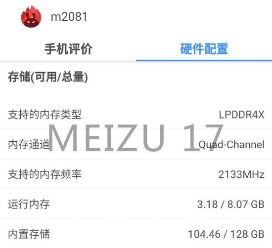 截图显示,魅族 17 采用8GB LPDDR4X内存,128GB存储。经IT之家求证,基本可以确认此截图属实。